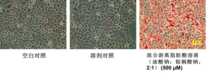 图 1. 本产品处理HepG2细胞24小时诱导脂肪肝细胞模型(油红染色)
