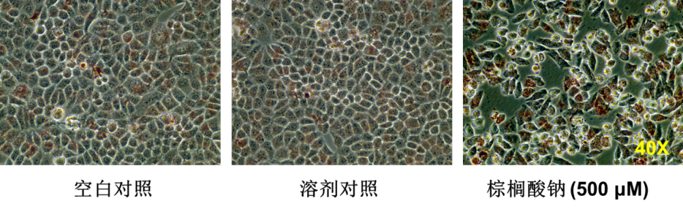 本产品有效成分是软脂酸钠(棕榈酸钠)(Sodium Palmitate, 20 mmol/L), 用于构建高浓度自由脂肪酸诱导的细胞损伤模型及疾病动物模型,常用于2型糖尿病、非酒精性脂肪肝病等基础科学研究。产品溶剂包含水,无脂肪酸牛血清白蛋白及一种缓冲溶液,不含氢氧化钠或其他碱性试剂及有机溶剂,无细胞毒性。本产品经0.22微米滤器过滤除菌,稳定,易溶,加入细胞培养基中或动物体内注射使用。